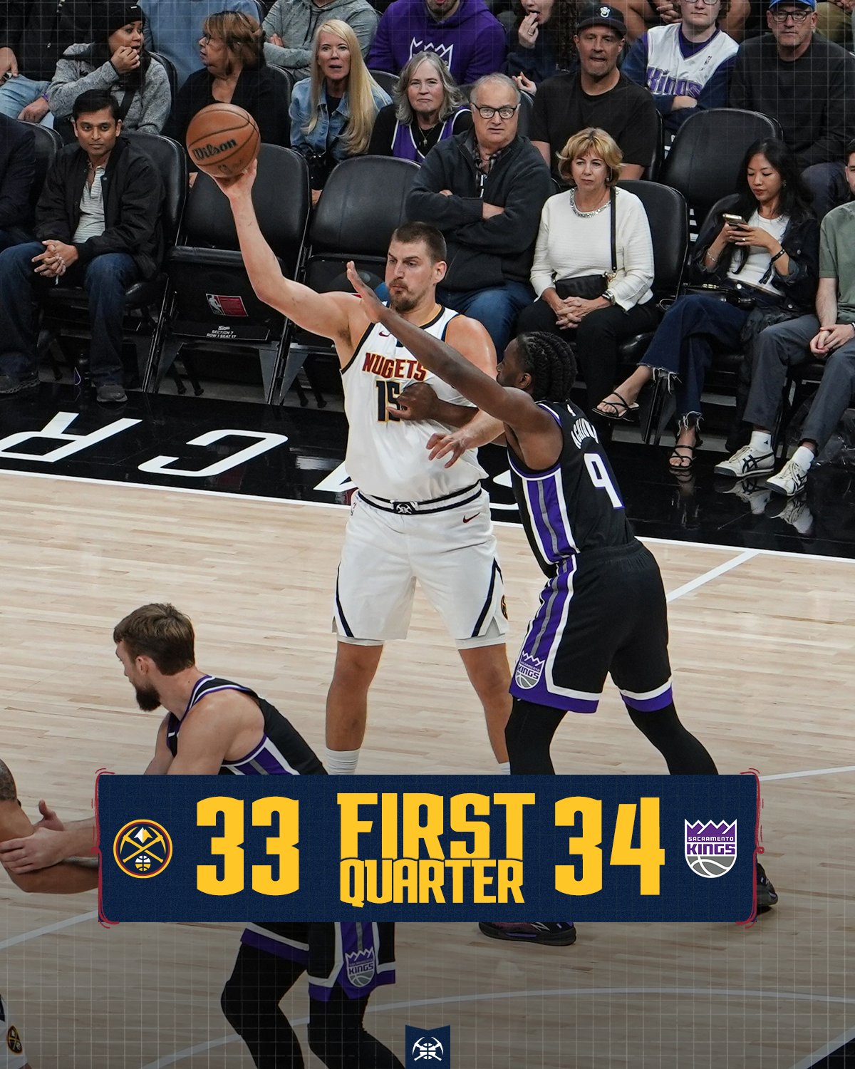 The Nuggets faced off against the Kings for the second time this season. Jokic and Sabonis had a big battle. The Nuggets' dual-core Jokic and Murray's pick-and-roll cooperation was very efficient. Jokic got everything he wanted on the offensive end. He made 6 of 6 shots in the first quarter and easily scored 12 points in a single quarter. He also grabbed 5 rebounds and sent 3 assists. After the first quarter, the Nuggets trailed 33-34 by 1 point.
