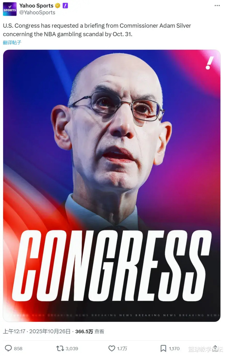 On October 26, according to Yahoo Sports, the House Energy and Commerce Committee of the U.S. Congress launched an investigation into the recent series of gambling scandals in the NBA: NBA President Adam Silver must report on the matter before October 31. Silver responded that he was "deeply shocked and disturbed" by the accusation.