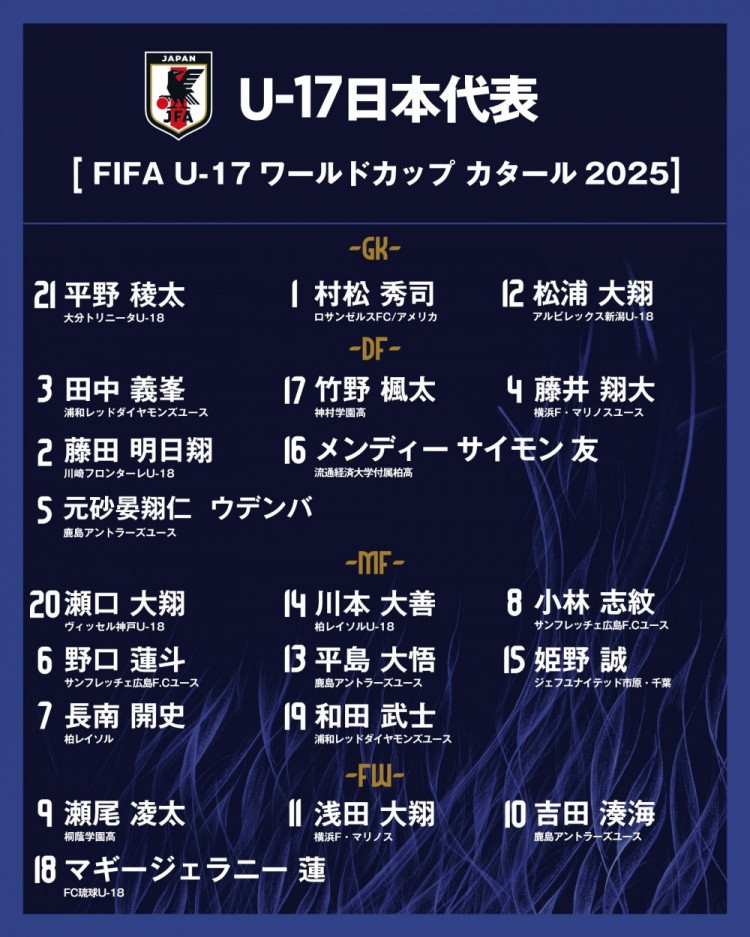 October 17th The official Twitter account of the Japanese national team was updated today, announcing the 21-man roster for the Japanese U17 national team to participate in the U17 World Cup. 4 mixed-race players and 1 overseas player were selected.
