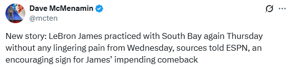 Sources revealed that this training is "extremely intense" and James is preparing to become the first player in NBA history to play in his 23rd season; the Lakers plan to conduct a training session at the team headquarters on Monday after the away trip. Sources revealed that if James continues to recover smoothly over the weekend, he may train with the team.