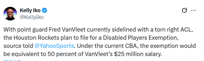 On October 28, according to famous reporter Kelly Iko, the Rockets planned to apply for an injury exception due to VanVleet's knee injury. If the exception application is approved, its value will be US$12.5 million, equivalent to 50% of VanVleet's annual salary of US$25 million.