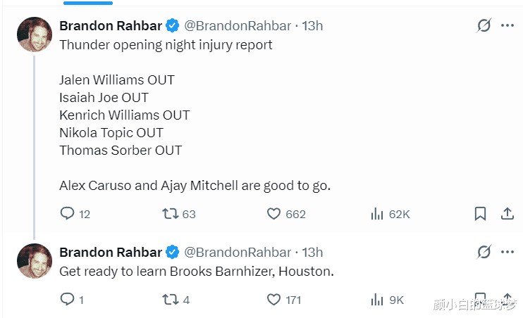 In addition to Jiewei being unable to play in the opening game, the Thunder's Isaiah Joe, Kenrich Williams, Nikola Topic, and Thomas Sauber will also miss the opening game. That is to say, five of the Thunder's players will not be able to play against the Houston Rockets at home.