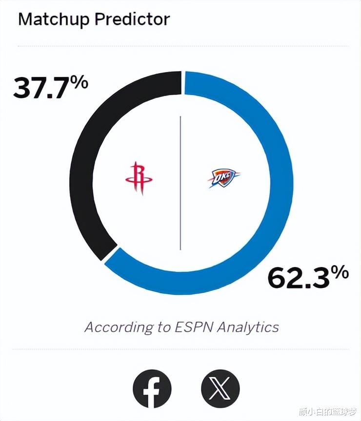 Although five members of the Thunder are absent from the opening game, ESPN still predicts that the Thunder's probability of winning as the home team is as high as 62.3%, while the Rockets' probability of winning as an away team is only 37.7%. Perhaps this is due to the hard power of the defending champion?