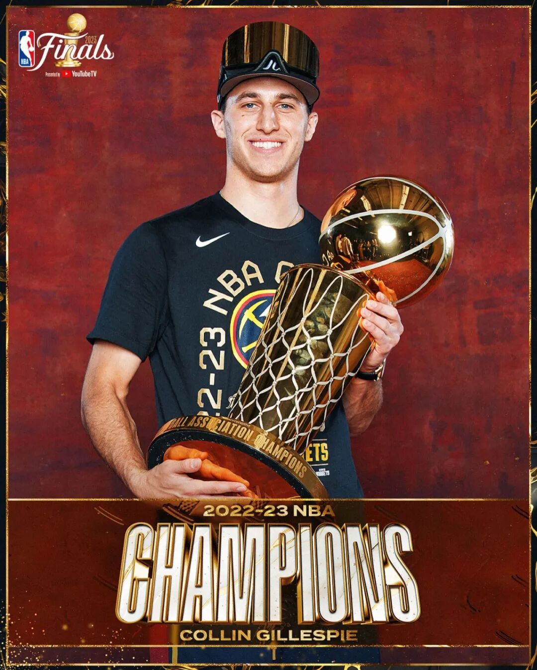 After losing the draft, Gillespie joined the Nuggets on a two-way contract. However, he missed all games in the 2022-23 season due to a broken leg. Fortunately, the Nuggets won the championship this year, and rookie Gillespie also became an NCAA+NBA double champion.