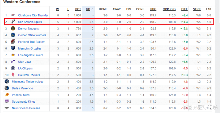 The best Spurs are yet to come. Once Fox, Sohan and Kornet are healthy, the Spurs' lineup will be more complete. Of course, the Spurs' five-game winning streak has something to do with the relatively easy start to the season. The opponents they defeated were the Mavericks, Pelicans, Nets, Raptors and Heat, and there has yet to be a super-powerful team at the championship level. Therefore, the Spurs youth team must remain calm. They still have some way to go before they can enter the championship ranks. They are currently the number one dark horse in the Western Conference, ranking second in the Western Conference with 5 wins and 0 losses. They are impacting the Western Conference pattern, making the situation in the Western Conference even more chaotic.