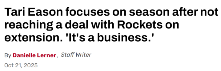 On October 22, in Ethan’s opinion, nothing had changed. The fourth-year forward and the Rockets failed to agree on a contract extension before Monday night's local time deadline, meaning Eason will become a restricted free agent next summer.