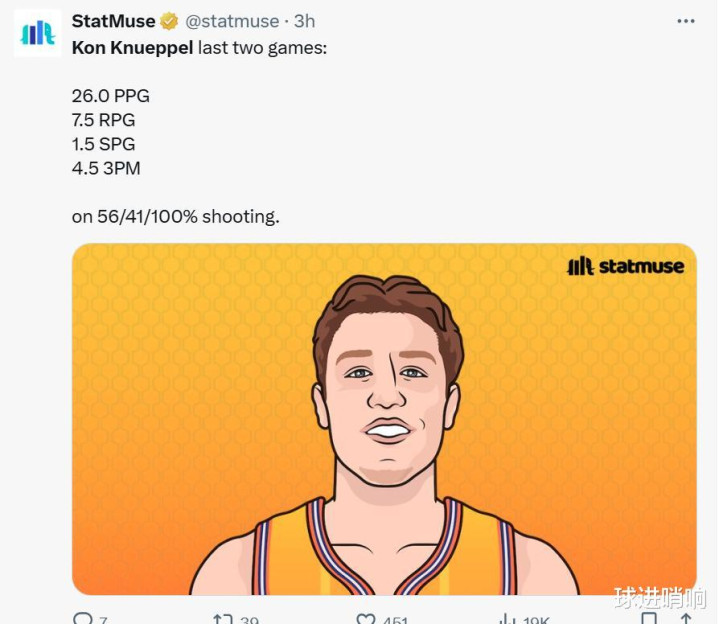More importantly, Knuupel still has a clear upward trend. Since November 2, Knuupel, who has gone through the running-in and adaptation stage at the beginning of the season, has averaged 22.3 points, 7.8 rebounds, 3.8 assists and 1 steal per game.