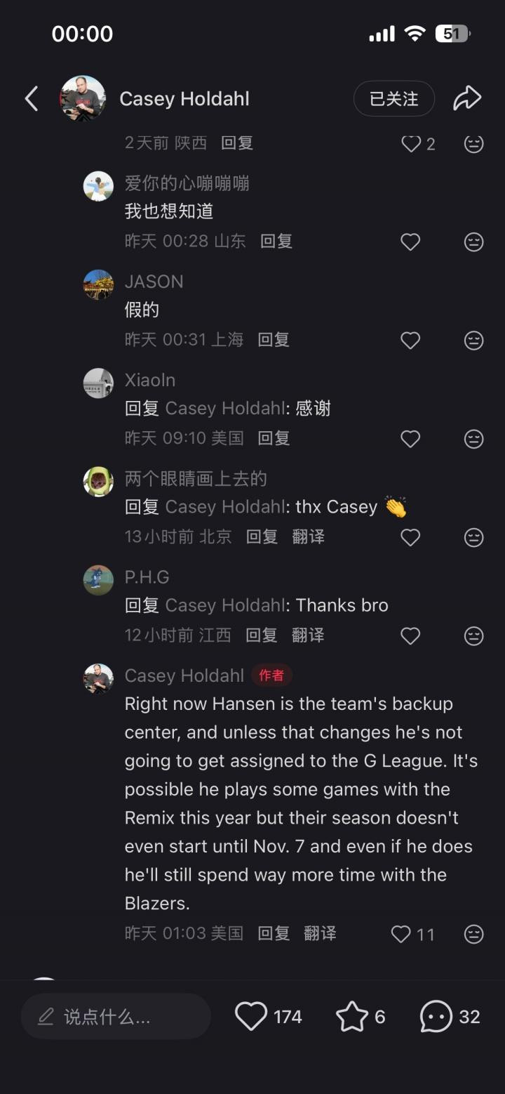 On October 22, the new NBA regular season will officially start today. Earlier today, in response to rumors that Yang Hansen was "delegated to the Development League", Trail Blazers team reporter Casey Holdahl opened a Chinese account and specifically refuted the rumors online.