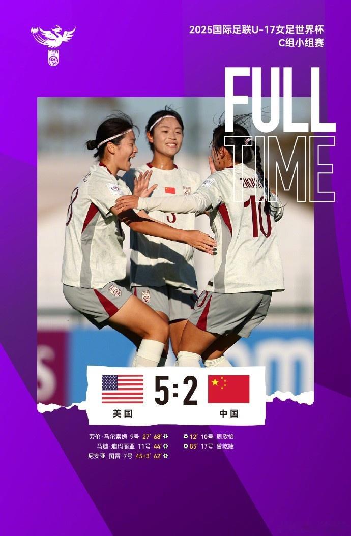 Entering the second half, the Chinese U17 women's football team stepped up their efforts, but overall they did not reverse the team's disadvantage. Toure scored twice in the 61st minute, and 6 minutes later, Malsom also completed the "double ring". In the 84th minute, Zeng Yijie scored with a direct free kick, helping the Chinese U17 women's football team recover 1 point. In the end, the team lost 2-5.