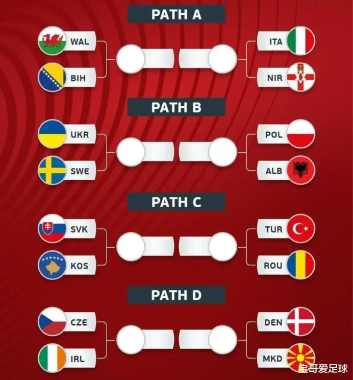 A total of 16 teams participate in the World Cup European play-offs, 12 of which are the second-place teams in each group stage. These 12 teams are divided into 3 tiers based on the latest world rankings (numbers in brackets), of which the first tier is Italy (12) , Denmark (21), Turkey (25) and Ukraine (28). The second-tier teams are Poland (31), Wales (32), the Czech Republic (44) and Slovakia (45). The third-tier teams are Ireland (59), Albania (63), Bosnia and Herzegovina (71) and Kosovo (80). In addition, the four teams of Romania (47), Sweden (43), North Macedonia (65) and Northern Ireland (69), as the top teams in the UEFA Nations League group in the 24-25 season, were also able to participate in the play-offs and were listed as the fourth-tier teams.