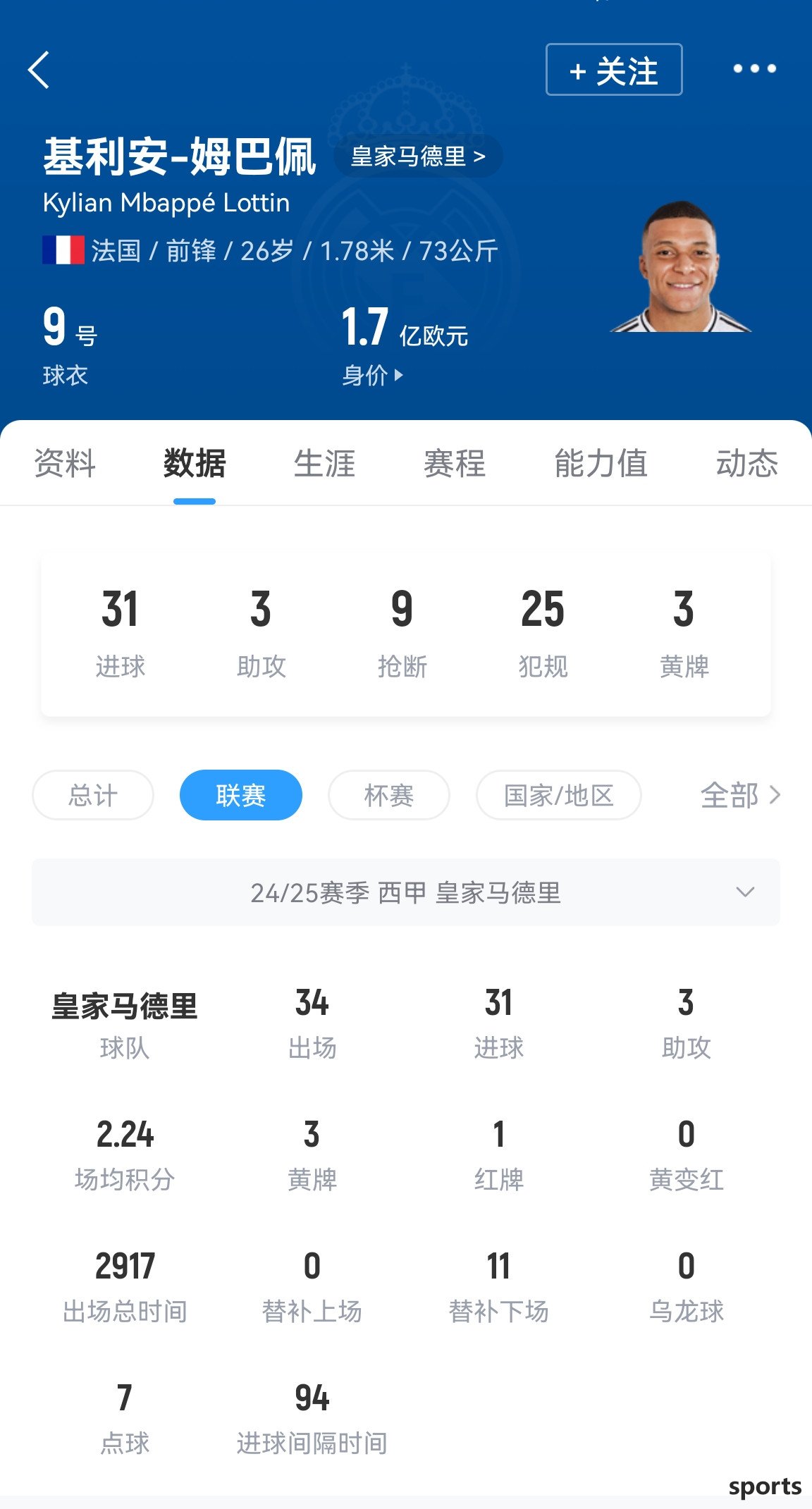 Bo Yuan interprets the data of Mbappe's first season in joining Real Madrid: "Mbappe scored 31 goals in La Liga and won the European Golden Boot Award. However, from big data analysis, we can see that Mbappe's Golden Boot Award is not very valuable. First of all, although he scored the most goals in the five major leagues, he is also the first person to miss the excellent opportunity in the five major leagues. He scored 31 goals and missed 29 excellent scoring opportunities. At the same time, Mbappe's goals had a high point content, 7 of the 31 goals came from penalty kicks, and 8 were scored 11 times in the whole season (7 of 9 in La Liga). What's worse, Mbappe almost completely gave up the competition for high balls, and averaged only 0.1 high balls per game, one-on-one, and did not like to grab points when crossing. He was finally determined At the center, the giants have no other forward and Mbappe, who completely gave up heading, which will greatly increase the defense and propulsion pressure in the midfield and backcourt. Even Mbappe will hardly compete for a ball that is not an excellent opportunity, and has very little running. In the Champions League, the average running average is 6.74 kilometers, and the two-round run against Arsenal was only 6.2 kilometers. His actual goal in the Champions League is also far lower than expected goals. All of the above are Mbappe's largest offensive resource, but his output method is single and he cannot return to the midfield and backcourt. It can be seen that the value of his European Golden Boot is questionable. The 2D playing style that does not compete for high balls is particularly harmful to Real Madrid. "