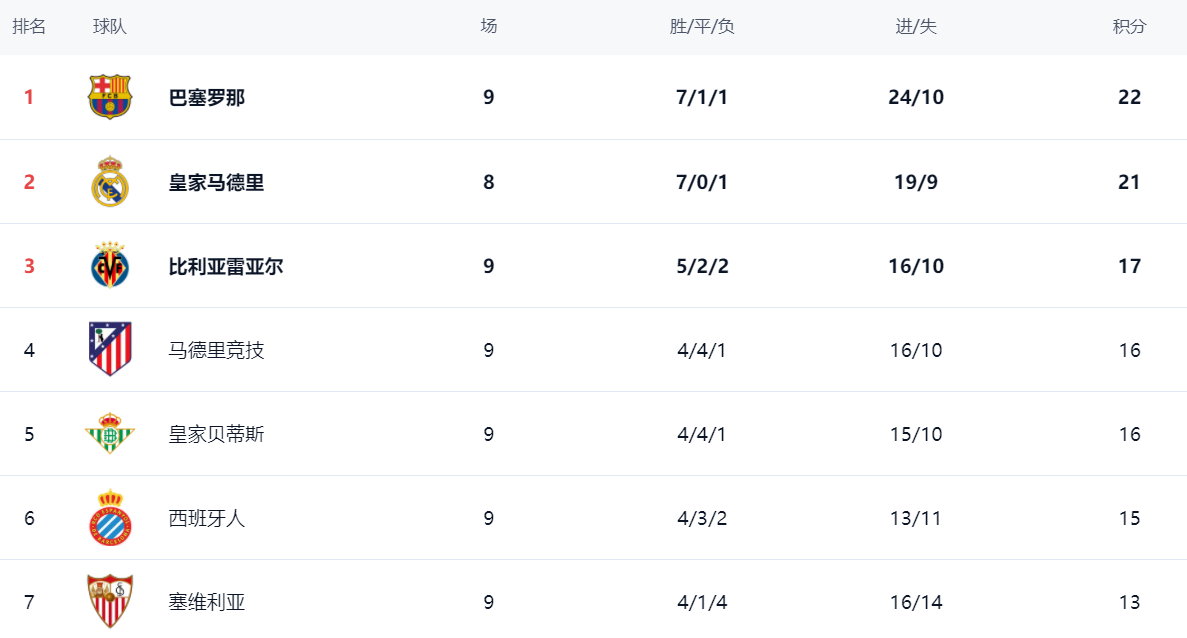 In the standings, Barcelona temporarily topped the list with 22 points. Real Madrid dropped to second place with 21 points. However, Real Madrid has played 1 less game than Barcelona. As long as Real Madrid wins the next game, they can regain the top spot. Villarreal ranks third with 17 points. Atletico Madrid, which won the game, ranked fourth with a total of 16 points. Real Betis also has 16 points, ranking 5th.