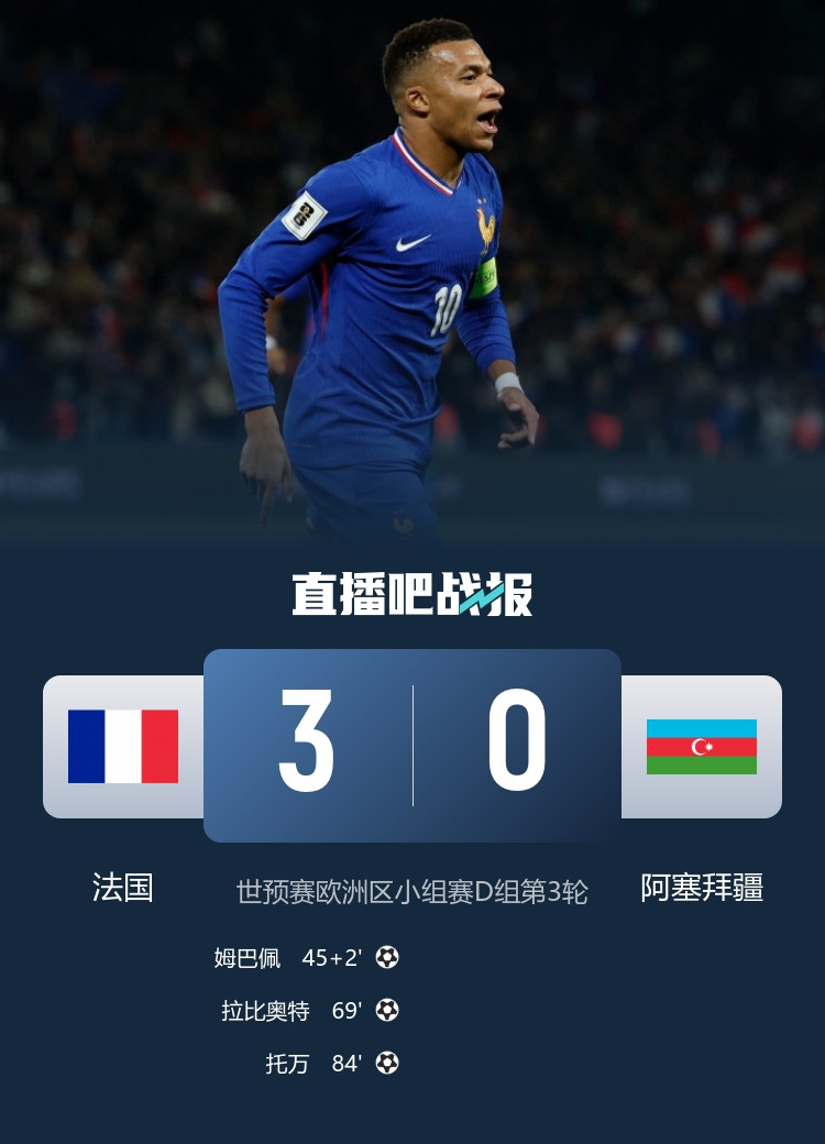 In the third round of Group D of the European Group Stage of the World Cup Qualifiers, France defeated Azerbaijan 3-0. Mbappe passed and shot, Rabiot and Thauvin scored.