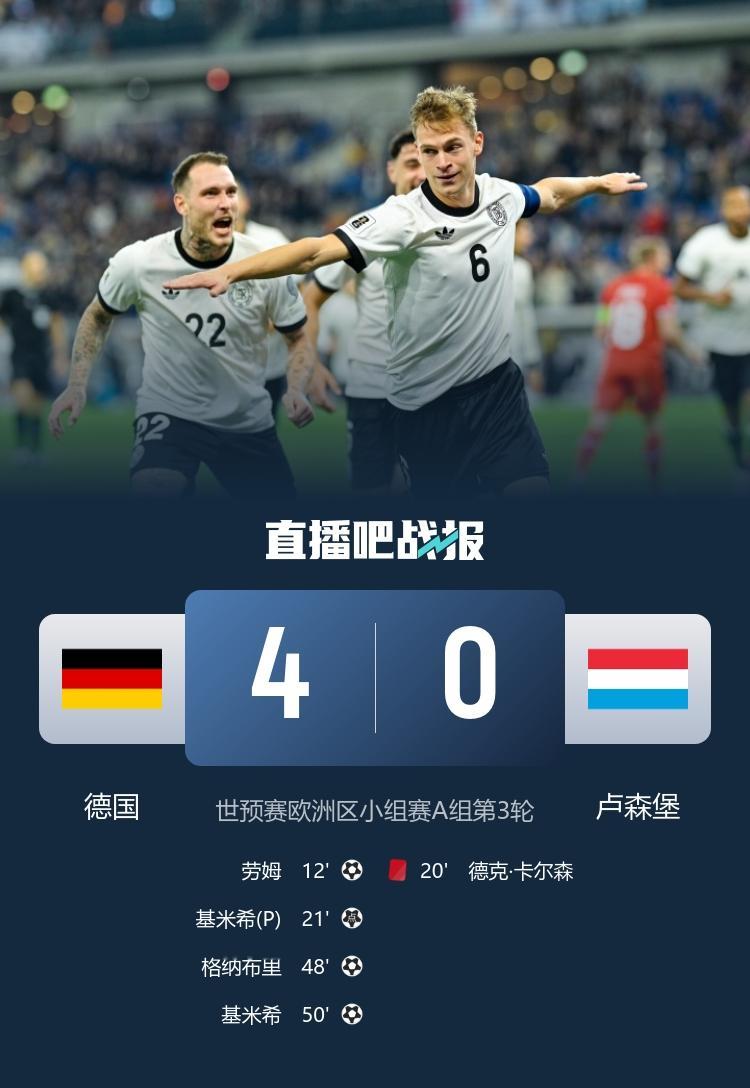 In the third round of Group A of the European Group Stage of the World Cup preliminaries, Germany defeated Luxembourg 4-0. Kimmich scored twice, Laum made a world wave, and Gnabry scored.