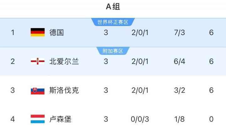 Group A Germany, Northern Ireland and Slovakia all have 2 wins and 1 loss, and the three teams have 6 points. Luxembourg has lost three games in a row and is at the bottom of the table.