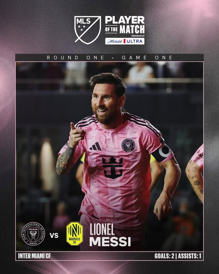 October 25th, in the first game of the MLS playoffs, Messi scored twice and Miami 3-1 Nashville. MLS officially announced that Messi was elected the best player of the match.
