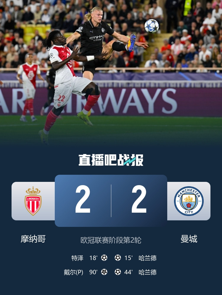 Today's Champions League, Arsenal 1-0 Olympiacos, Manchester City tied 2-2 by Monaco, and Newcastle defeated San Giros 4-0.