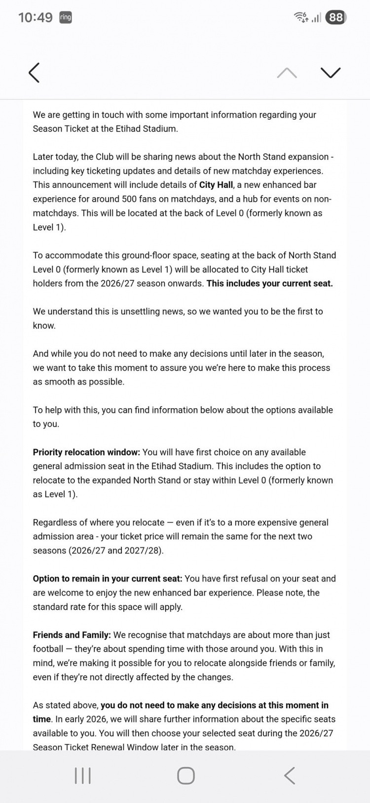 On October 24, a Manchester City fan with the account “dmmcfc” posted a message saying that his Manchester City season ticket seats were affected due to the expansion of the stadium.