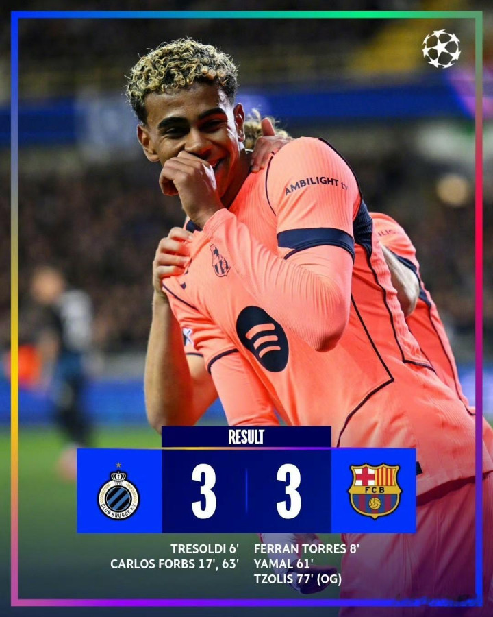 Bruges drew 3-3 with Barcelona. Tresoldi scored first in the first half, Ferran Torres equalized in lightning, Borges scored a single goal, Yamal equalized in the second half, Borges counterattacked and scored twice, Yamal caused Szolis' own goal, and Furmant's goal was disallowed.