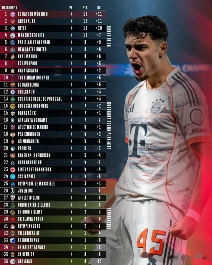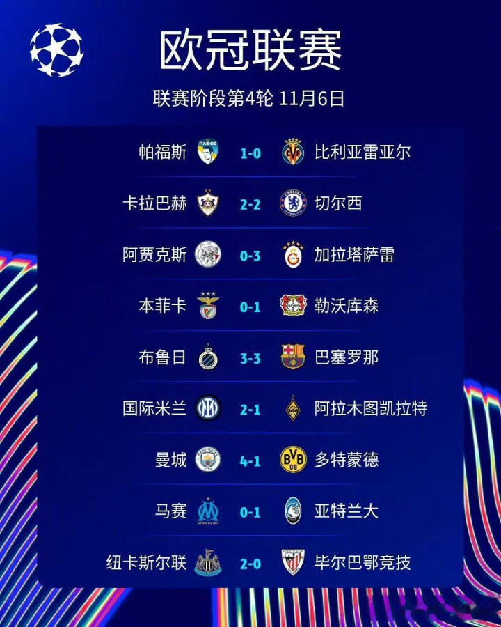 November 06, the fourth round of the UEFA Champions League in the 25/26 season. Barcelona plays Club Brugge away and Chelsea plays Qarabag away. The two teams currently have 6 points and are temporarily in the play-off zone.