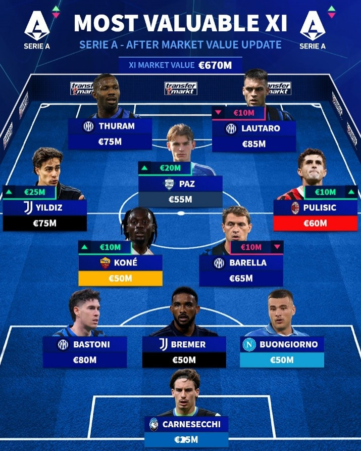 Midfielders: Ildidiz (Juventus, 75 million euros), Pas (Como, 55 million euros), Pulisic (AC Milan, 60 million euros), Cone (Roma, 50 million euros), Barrera (Inter Milan, 65 million euros)