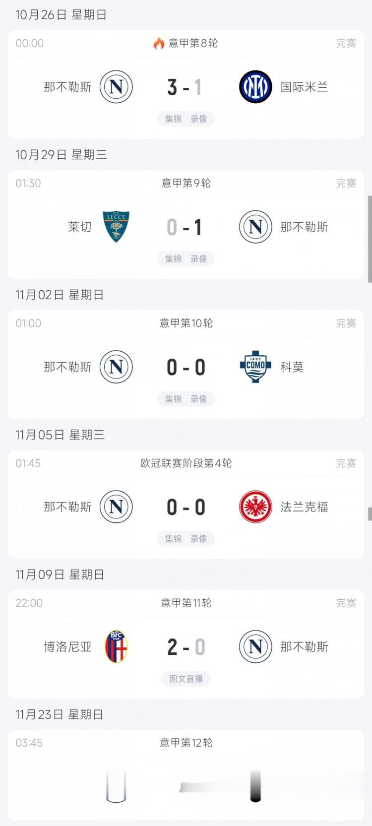 November 9th: In the 11th round of Serie A, Naples lost 0-2 to Bologna in an away game and suffered three consecutive zero shutouts.