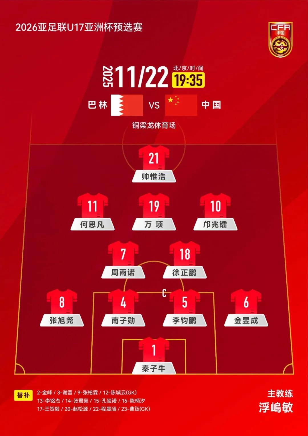 In this game, the starting lineup of the national junior team is goalkeeper Qin Ziniu, defenders Zhang Xuyao, Nan Zixun, Li Juncheng, Jin Yucheng, midfielders Xu Zhengpeng and Zhou Yunuo, and the frontcourt attack combination is He Sifan, Wan Xiang, Kuang Zhaolei and Shuai Weihao. As far as this lineup is concerned, the back line has actually undergone major changes compared to the original lineup, mainly focusing on the three positions of goalkeeper, center back and right back, while the midfield and frontcourt lineups are relatively stable. In the substitute lineup, the two players on the offensive end are the key. Center Zhang Bolin and right winger Xie Jin are the backhand weapons of the National Junior Team. Liang Shiyu's absence is a big loss for the 2009 National Junior Team.
