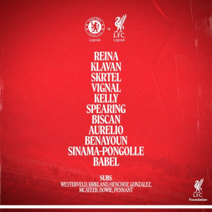 At 22:00 on October 11, a legendary friendly match started at Stamford Bridge between Chelsea Legends and Liverpool Legends. For Chelsea, famous players such as Terry, Cech, Hazard, and Diego Costa will appear; for Liverpool, famous players such as Skrtel, Benayoun, and Reina will play.